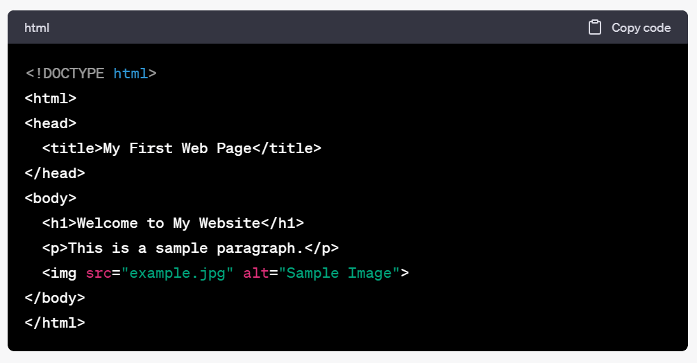 In this snippet, HTML provides the basic structure, defining the title, heading, paragraph, and an image on the webpage.