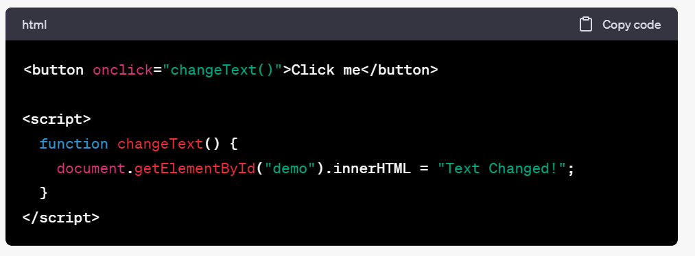 updates the content inside an HTML element with the id “demo” when the button is clicked, demonstrating the interactive capabilities of JavaScript.